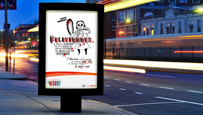 Diseños e ilustraciones realizadas para la agencia de publicidad Publicis España con motivo de anunciar el X Aniversario de El Megahit, programa especializado en cine de Telemadrid. ART DIRECTION & ILLUSTRATION Client: Publicis - Telemadrid